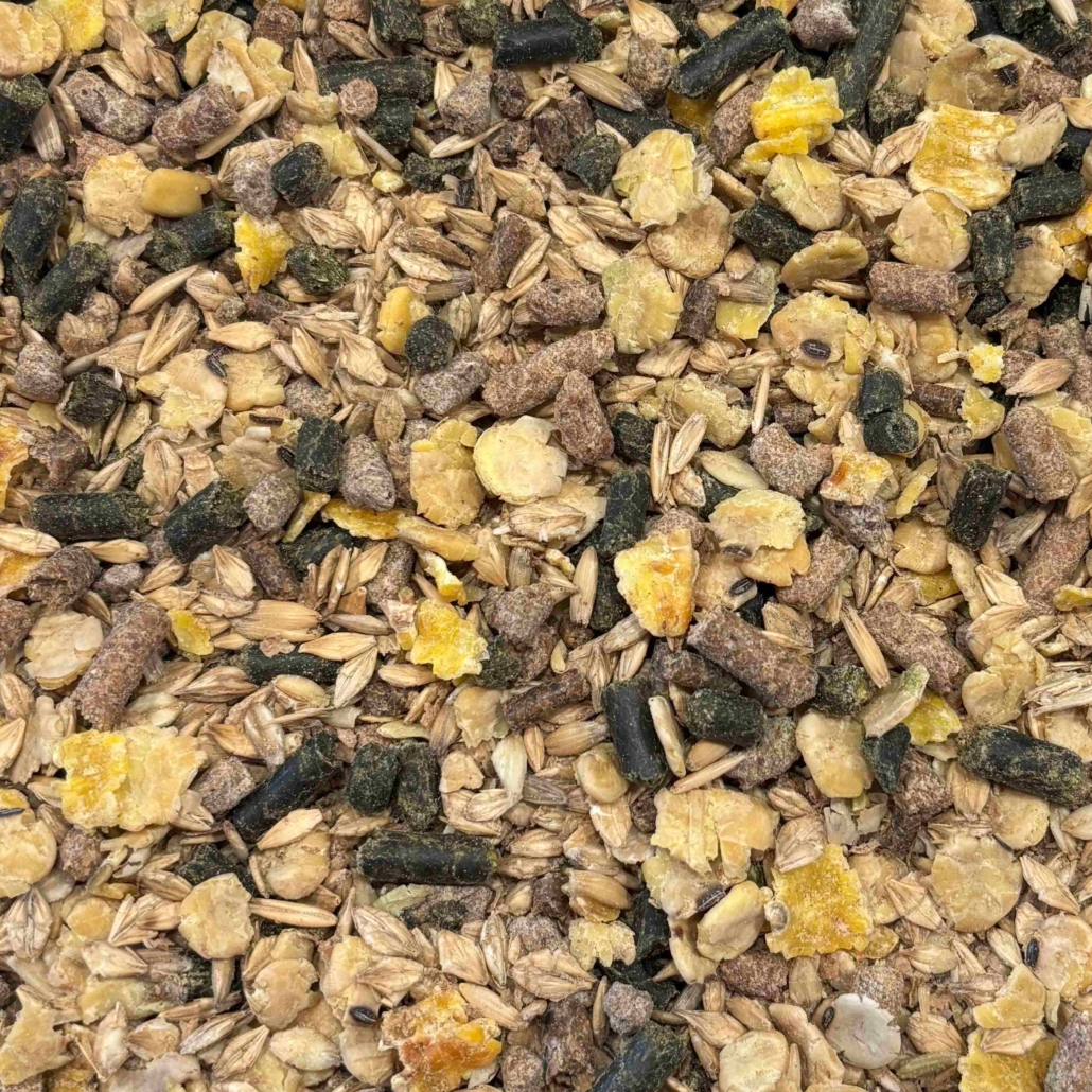 Luzerne, gerstvlokken, tarwegries, getoaste sojabonenvlokken, zonnebloemolie, maisvlokken, havervlokken, tarwezemelen, haverschillen, sojaschroot, di-calciumfosfaat, lijnzaad, natrium chloride, calcium carbonaat, tarwe, zonnebloemzaadschroot, melasse, kool- en raapzaadschroot, magnesiumoxide, lijnzaadolie
